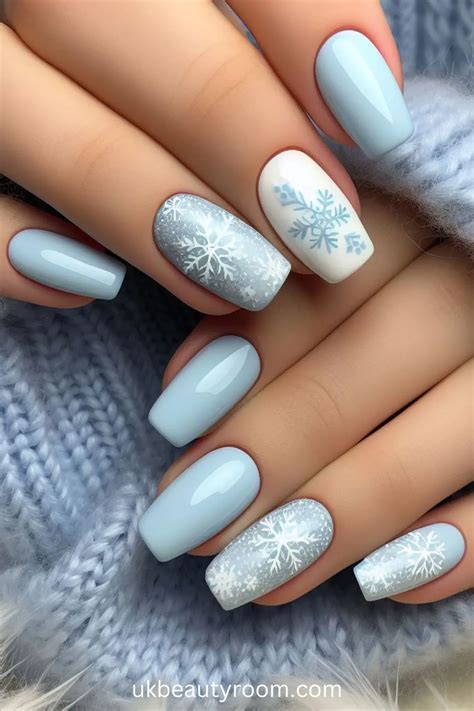A: Winter-inspired nail decals, ombre designs with blue and white, or hand-painted winter scenes