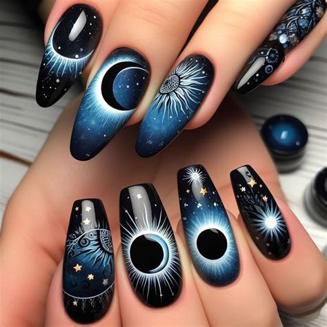 For a photo voltaic eclipse impact, paint your nails a lightweight base coloration. Apply a small, opaque dot to the middle of your nail, representing the solar. Encompass the dot with a darkish coloration, making a halo impact that symbolizes the corona of the eclipse.