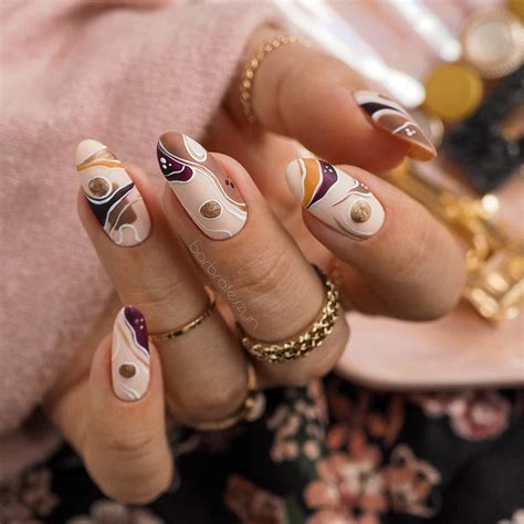 Begin with a base coat in a impartial shade. Use a nail artwork brush or toothpick to create summary shapes and contours with fall-themed colours.
