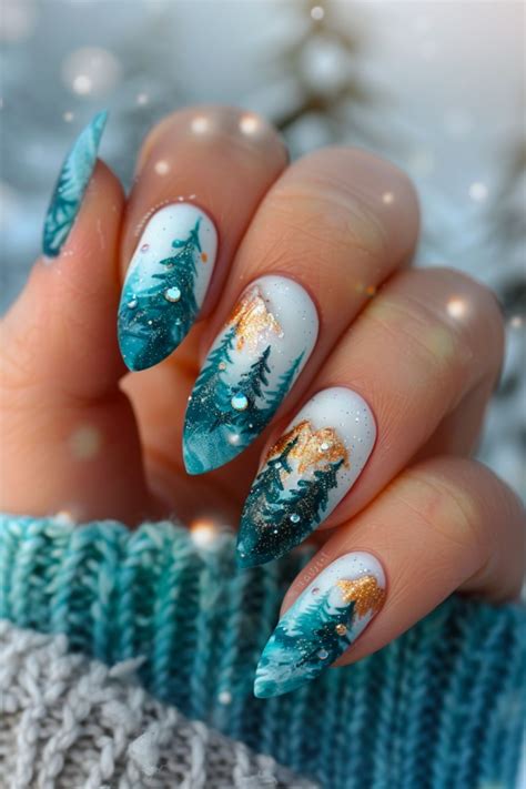 Seize the breathtaking landscapes of winter in your nails. Paint a gradient impact utilizing shades of blue, white, and silver to create a snowy mountain scene. Add white snowflakes or dots for texture and depth.